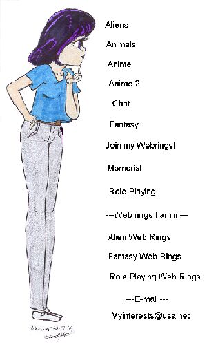 Select the page you want, and hit GO! ------ Main Page! ------ Role Playing Alien Page Anime site Sign NEW Guest book View Guest Book View NEW guest book! ANIME SITE #2! Titanic My Awards About ME! Links page Chat Room My Forums Page My second Forums page fantasy page Disanime Page dedicated to animals ------ e-mail updates Anime E-mail list Alien E-mail list Role Playing e-mail list Fantasy e-mail list Send a card! Or pick up one! ------ List of my web rings! Alien Web Ring! Alien Web rings I'm in! The Anime Web Ring! The Role Playing Web Ring! Role Playing Rings I'm in! The Fantasy Web Ring! My Fantasy Web Rings ------ Wanna win an award? :) Awards I won :) ------ E-mail me!